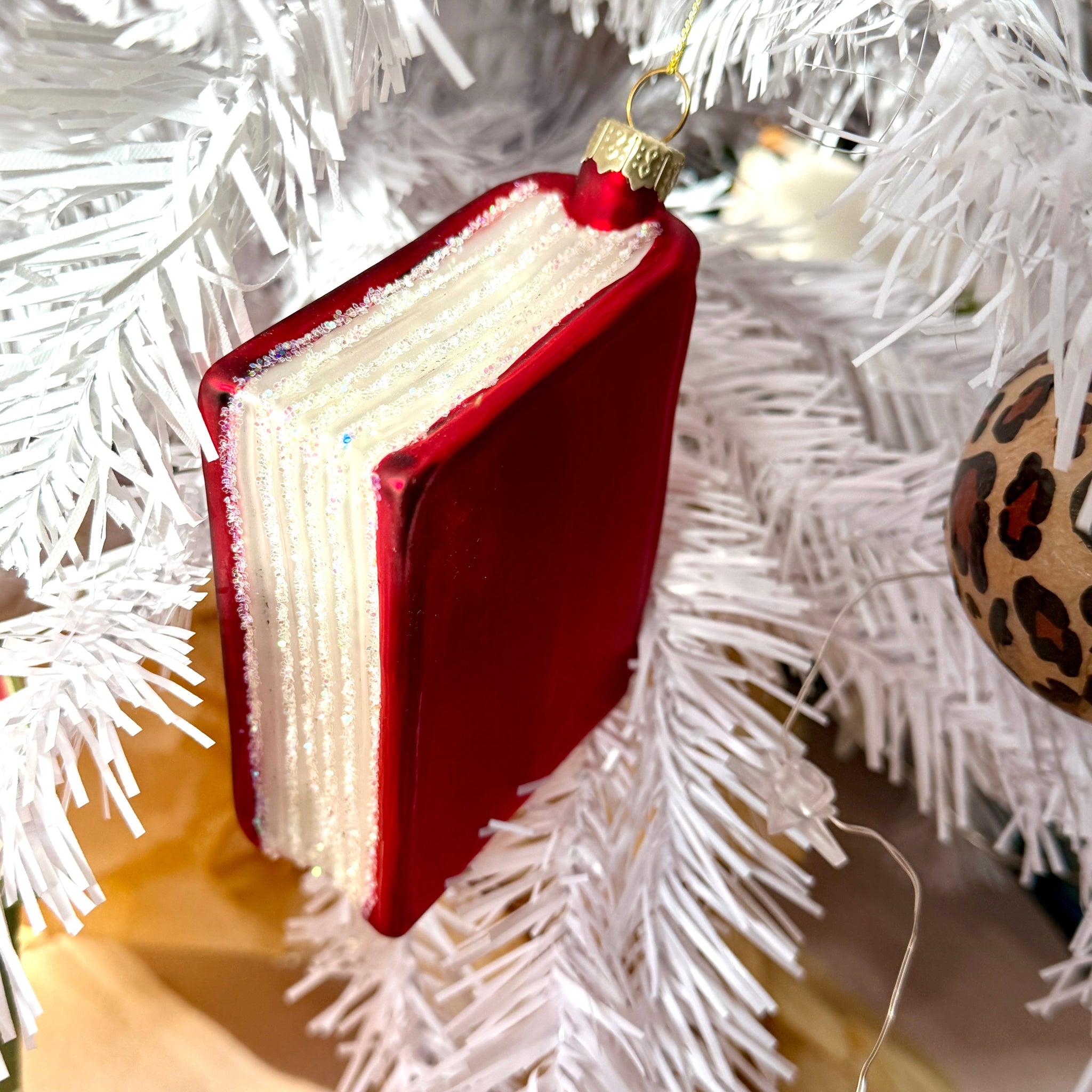This charming glass ornament resembles a classic red book featuring a glitter-framed cover of The Night Before Christmas. With shimmering “pages” and a gold hanging loop, it adds a nostalgic, storybook touch to any tree. Perfect for book lovers and holiday collectors, it brings warmth, whimsy, and timeless Christmas magic to your décor.