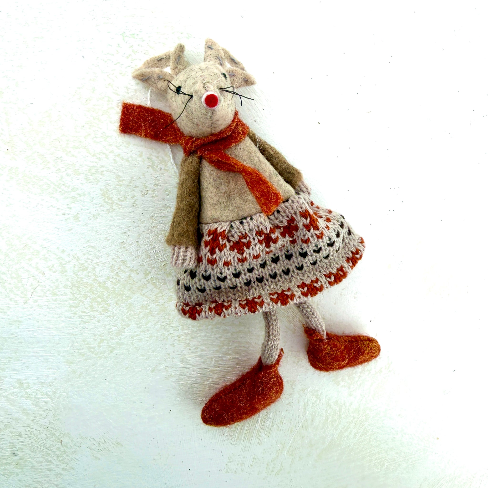 This charming hanging felt mouse is dressed in warm autumn tones, featuring a hand-knit skirt, cozy scarf, and soft woolen boots. With delicate whiskers and sweet details, she adds a whimsical, handcrafted touch to seasonal décor. A delightful character perfect for gifting or displaying year-round.